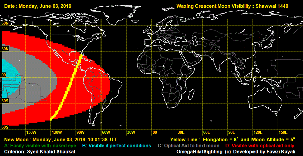 D’après un communiqué « officiel », l’aid a lieu ce lundi 3 juin au Mali. La question que nous nous posons est comment le Mali a-t-il pu voir la nouvelle lune avant même qu’elle n’ai eu lieu ? On aimerait avoir des preuves (photos, témoignages) car c’est contradictoire avec le calcul scientifique. C’est comme si on dit qu’on a vu le soleil se lever alors qu’il fait encore nuit. Pays où l’aid el fitr sera mardi 4 juin La nouvelle lune astronomique aura lieu le lundi 3 juin 2019 à 10h03, temps universel. Ce jour-là, près de Miami, en Floride, l’élongation est de 8 degrés au coucher du soleil et la lune à 5 degrés au-dessus du soleil. Par conséquent, le premier jour Shawwal 1440 devrait avoir lieu mardi 4 juin. Annonces officielles