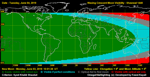 Officiel : l’aid al fitr mardi 4 juin en France, Belgique et Arabie Saoudite Nous sommes aujourd’hui le 29 du mois de Ramadan qui précède le mois de Chawwal. Ce soir, c’est une nouvelle nuit du doute « laylatou chekk ». Si le mois de Ramadan prend fin ce soir, ce qui devrait être le cas d’après le calcul scientifique, l’ai sera pour demain mardi 4 juin. Si le croissant de lune de Shawwal n’est pas observé, on continuera alors à jeûner et l’aid sera donc mercredi 5 juin, mais c’est vraiment peu probable. Visibilité du croissant de Chawwal lundi 3 mai ![]() Vision du croissant de la nouvelle lune de Chawwal mardi 4 mai Nous vous tiendrons informé de l’annonce officielle de la fin du Ramadan le monde au fur et à mesure qu les informations nous arrivent. Pays où l’aid el fitr est aujourd’hui : lundi 3 juin