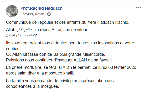 L’information a été donnée par son épouse durant la nuit du 2 février sur la page Facebook du frère Rachid Haddach :