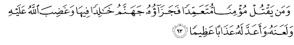« Quiconque tue intentionnellement un croyant, Sa rétribution alors sera l’Enfer, pour y demeurer éternellement. Allah l’a frappé de Sa colère, l’a maudit et lui a préparé un énorme chAtiment » [Les femmes, an-Nissa, verset 93]. et Il dit aussi, Gloire et Pureté à Lui :