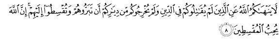 « Allah ne vous défend pas d’être bienfaisants et équitables envers ceux qui ne vous ont pas combattus pour la religion et ne vous ont pas chassés de vos demeures. Car Allah aime les équitables. » [L’éprouvée, al-Moumtahana, verset 8]. Ce verset signifie que les Musulmans doivent être bienfaisants envers les non musulmans qui ne les ont pas combattus ou chassés de leurs demeures. En fait, la solidarité et la bienfaisance permettent de promouvoir l’Islam auprès du non musulman sans pour autant adhérer à ses principes. Dans ce cadre, Allah dit :