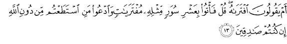 Et Allah défia les hommes et les génies d'apporter dix chapitres (Sourates) semblables aux chapitres du Coran, et ils n'y parvinrent pas, Allah a dit :{Dis : Apportez donc dix chapitres, comme lui, forgés de toutes pièces et faites appel à qui vous pouvez en dehors d'Allah si vous êtes sincères} [Sourate 11 - Verset 13] Et enfin, Allah leur demanda d'apporter un seul chapitre semblable au Coran, et ils n'y parvinrent pas non plus, Allah a dit : {Si vous avez quelque doute sur ce que Nous avons fait descendre sur notre esclave (serviteur), apportez donc un chapitre dans son genre et faites appel à vos témoins autres qu'Allah si vous êtes véridiques. Si vous ne le faites pas et vous ne le ferez jamais, craignez alors la Fournaise dont le combustible sont les Humains et la pierraille, et qui a été spécialement aménagée pour les négateurs} [Sourate 2 - Versets 23-24] Allah a fait descendre le Coran comme un miracle par miséricorde de la part d'Allah envers ses serviteurs pour qu'ils sachent que le Coran est la parole d'Allah, qu'il est le Dieu véridique et que Mohammed est un véritable messager d'Allah, car le Coran est la plus grande preuve qui nous indique les qualités de notre Seigneur, Allah a dit :