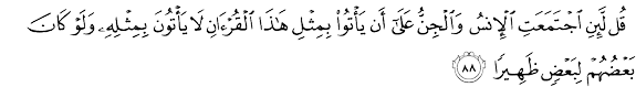 {Dis : Si les Humains et les Génies se joignaient les uns aux autres pour apporter quelque chose de semblable à ce Coran, ils n'apporteraient pas son pareil même s'ils se soutenaient mutuellement} [Sourate 17 - Verset 88]